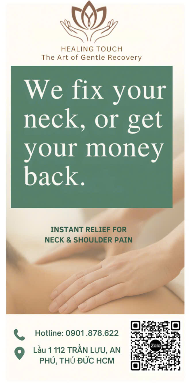 Quy trình: Khách hàng ngồi thoải mái trên ghế chuyên dụng. Kỹ thuật viên bắt đầu từ vai và cổ để giải phóng căng cứng, sau đó di chuyển lên vùng đỉnh đầu, thái dương và trán theo các điểm huyệt đạo. Kết hợp tinh dầu dưỡng tóc hoặc dầu dừa nguyên chất theo yêu cầu. Kết thúc bằng động tác kéo giãn nhẹ vùng cổ và bài tập thở để thả lỏng hoàn toàn.