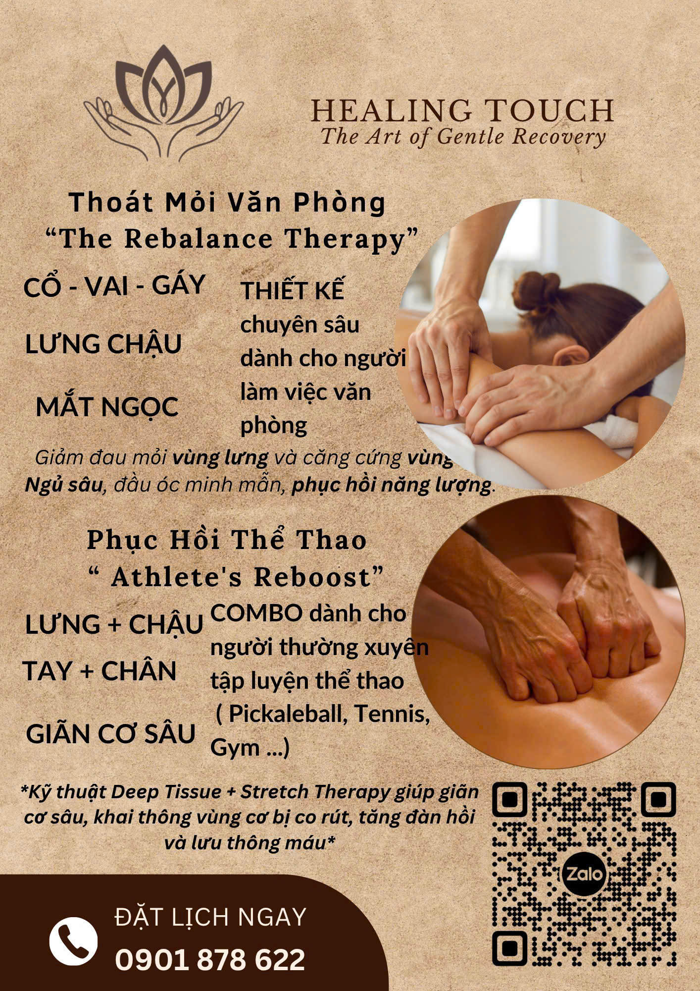 Quy trình: Bắt đầu bằng buổi tư vấn ngắn để xác định vùng trọng tâm và mức độ áp lực phù hợp. Kỹ thuật viên áp dụng deep tissue (ấn sâu), trigger point therapy (trị liệu điểm kích hoạt), và myofascial release (giải phóng cân cơ) tùy theo nhu cầu. Kết thúc bằng stretching nhẹ để kéo giãn và giải phóng cơ hoàn toàn.